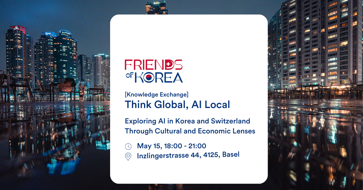 Friends of Korea warmly invites you to an evening of connection and insight, where we take a closer look at how artificial intelligence is shaped by culture, society, and innovation in both Korea and Switzerland.
